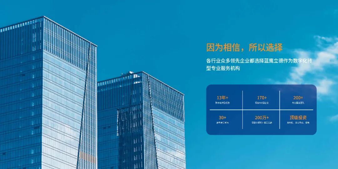 “ 跨越13年 变革,正在发生   自2009年诞生之日起,蓝鹰立德始终拥抱创新、立足当下,专注致力于数字科技领域,聚焦企业数字化转型,不断用科技提升实力,用智慧驱动进步。   蓝鹰立德以“数字员工,智慧企业”为宗旨,为客户提供面向未来的数字化转型升级服务。   作为专业的数字技术服务商,蓝鹰立德借助人工智能、大数据、云计算等技术构建企业办公的新场景与新模式,成为行业进步的创变驱动力。 蓝鹰立德,用十三年的坚持,成就不凡   在每一个蓝鹰人的矢志奋斗下,我们不断成长,完成一次次蜕变。 目前,在北京、上海、广州、深圳等各地均设有专业服务团队,形成覆盖全国的服务体系。   蓝鹰立德如今专业顾问已超过200人,服务国内外500强企业超过170家,成为了国内领先的数字化转型专业服务机构,为用户创造价值。我们始终坚信企业的长远发展蓝图,未来必将由我们创造。 蓝鹰立德,为客户创造价值,共同成长   十三年来,蓝鹰立德一直以先进理念、扎实技术、高效服务引领创新发展,深入企业业务场景,发掘用户深层需求,构建了覆盖多领域的信息化、智能化、标准化的产品体系,满足客户的真正需求,解决实际业务的核心痛点,陪伴客户伙伴一同成长,合作共赢。 - 蓝鹰立德正式成立 - 成为 SAP 金牌合作伙伴 - 成功签约万科地产里程碑项目 - 共享服务产品成功发布1.0 - 开拓海外—柳工欧洲项目成功上线 - 成为SAP研究院开发合作伙伴 - 参与SAP标志产品开发测试 - 世茂地产项目成功上线 - 成为SAP SF合作伙伴 - 首家大型银行全员绩效等项目上线 - 累计服务超过20家全国500强客户 - 绿城地产项目成功上线 - 蓝鹰立德北京分公司成立 - 蓝鹰立德成都分公司成立 - 累计服务超100家超大型企业客户 - 融创集团、富力集团等项目上线 - 蓝税产品开始研发 - 首家大型银行的蓝税项目成功上线 - 面向全球—中海地产全球项目启动 - 获得票税服务公司上海云砺风投 - 签约鹏瑞集团、融信集团等重要客户 - 蓝税产品成功获得上百家客户青睐 - 陆续获得深创投、华业天成等机构投资 - “数字员工,智慧企业”方案正式面世 - 蓝鹰立德广州分公司成立 - 蓝鹰立德上海分公司成立 - 蓝税列入SAP Store 应用产品商店 - 签约平安银行、华润集团、合众新能源等灯塔客户 - 荣膺新旗奖——2022最佳解决方案 - 成功签约宁德时代,平安银行、绿城中国、钱大妈集团、合景悠活集团、美巢集团、丰源产业群、盛泰集团、邢台燃气集团、上海芮豪等大批客户 - 蓝鹰立德获得“国家高新企业”认证 - 蓝鹰出海—华达利家具印度公司项目成功上线 - 蓝鹰立德董事长赵佶获评2022行业影响力人物 - 蓝税获评2022产品科技创新奖 - 蓝税产品入选2022中国人力资源服务品牌100强 - 成为 SAP 最佳创新合作伙伴 把客户变成伙伴,与公司一起成长 2009—2022,蓝鹰立德这13年来,是与客户们共同思考、共同求索的历程,是蓝鹰立德得到客户认可、信任、帮助的成长历程。从始到终,蓝鹰立德都把与客户最好的关系定义为“伙伴”,相互尊重,彼此信赖。 正是基于这种稳定的“伙伴”关系,这十三年来,蓝鹰立德得以收获了包括中国平安,万科集团、招商银行、紫金矿业、华润集团、宁德时代、绿城中国、广汽集团、合景集团、蓝思科技等集团在内的170多家500强企业的认可。 (蓝鹰立德部分客户) 正值此蓝鹰立德成立十三周年之际,蓝鹰立德公司全体同仁向长期以来给予我们信任与机会的客户伙伴表示由衷地感谢! 饮水思源,每当我们回顾过去、总结成绩的时候,我们深知各位客户伙伴给予的信任与机会才是蓝鹰立德成长与发展的源泉。 回顾过去,远眺未来 蓝鹰立德将站在新的起点 锐意进取,奋楫笃行 为数字化事业奉献力量 续写未来更辉煌的新篇章!编辑搜图编辑搜图编辑搜图编辑搜图